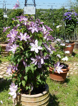 大きなスペースに這わせてあるもの,品種別に1株ずつ大鉢に植えてあるものなど様々.品種が多くてクレマチス図鑑でも出来そうな感じ.