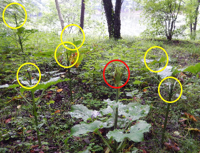 7本あったうちの1本(赤丸)だけ花芽があり,黄色丸は花茎のみ.