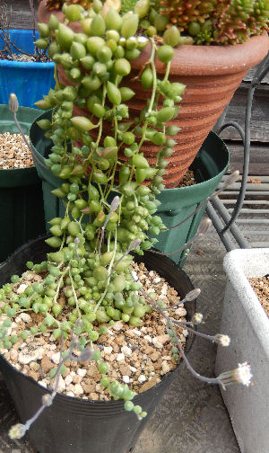 台風対策で棚から下ろし,近くのスリットポットの上に乗せていた.たまたま下にあった黒ポリポットに着地,引っ張ってもとれなくなってしまった…どうやら根付いた模様.