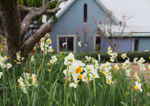 花の文化園・レストラン横のスイセン花壇.風は冷たく日が陰ると寒いのに,既に多くのスイセンが開花中.カメラを持った人たちがポツポツと訪れている.