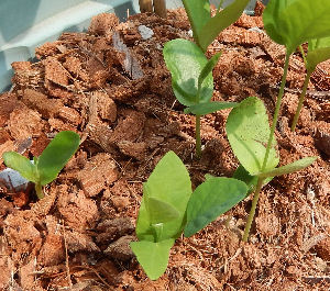 クリトリア寄せ植え鉢を見ると,今頃になって発芽してきた苗を発見.後で播いた八重のものか,あるいは古種のものか?