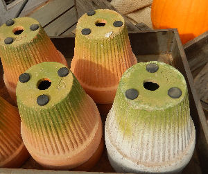 鉢底に付いているゴムの○パッチ.地面に鉢を置いても鉢底穴と少し間が保てる.過湿防止には良さそう.…と思ったが,これだったら家で加工できそうと思い買わず.(^^;