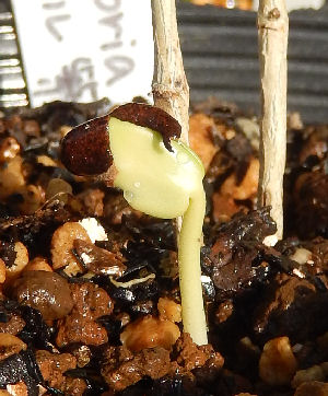 白っぽい新芽が種帽子を被って地上に出てきた.