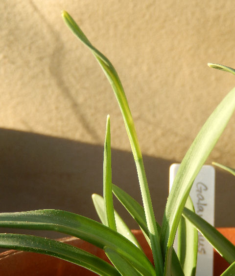 そしてこちらは我が家のスノードロップ.2株あるうちの1つ,花芽のアップ.ちゃんと花芽は付いたものの,フリーズしたまま動かず.南ベランダで日中暖かすぎるのか,水分不足になっているのか.