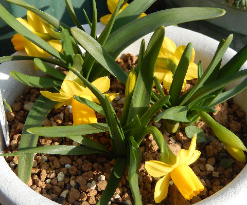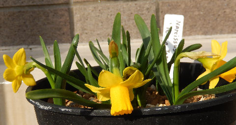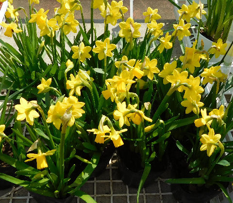 スイセンのテータテート.(Narcissus cyclamineus cv. 'Tete a tete')昨年園芸店で入手し,2鉢に植え替えた.いずれも北バルコニー在住.同時に仲良く開花.春の訪れを感じさせる鮮やかな黄色.
