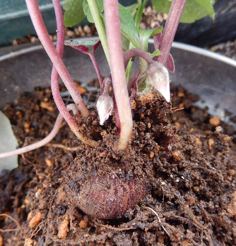 このポットには大きく育ったシクラメンが同居していた.おまけにシクラメンには花芽が付いている.そこで先日シクラメンを独立させようとポットから株を抜いてみた.