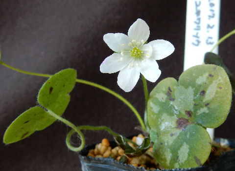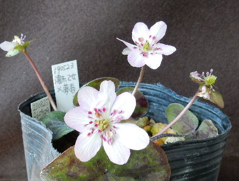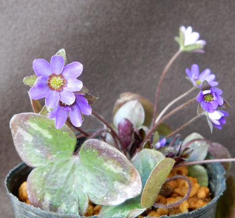 そういう目で見ると,チビ苗の方は土がキレイで新しく植え替えられたものと分かる.で,チビ苗の方の葉に注目.点々があるが病気ではない.こういう雪割草独特の模様らしい.思わず「これって病気?」と聞いてしまったが…(~_~;) 病気だったら裏を見ると白抜けするらしいが,これは裏もしっかり茶色=模様になっている.聞いて一安心.こちらは2013年の春にやはり京都で購入したもの.毎年蓼科で夏越ししていたため,蓼科と大阪を行ったり来たり.初年度は蓼科で地植えにしたが,その後ポット上げ.名前が付いていたと思うが名札はとうに行方不明.(^^;
