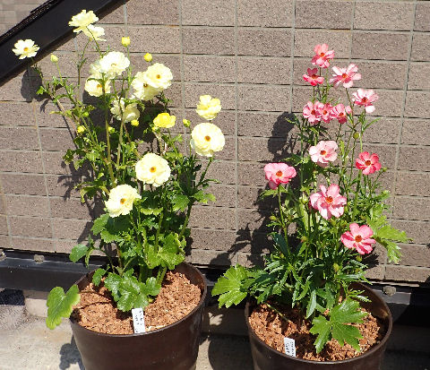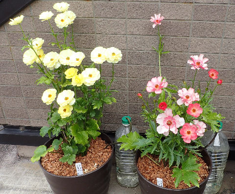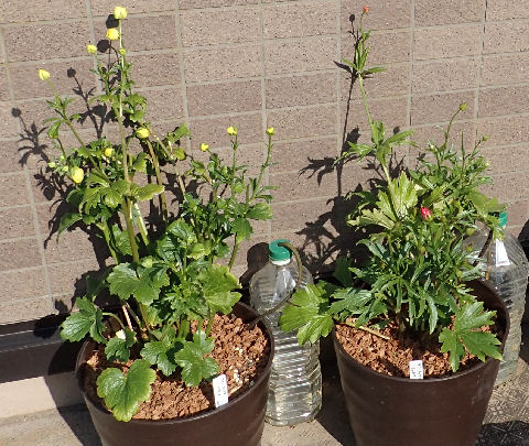 左画像は朝の状態.花がたくさん咲いているのを蓼科行きのため全部カット,給水ペットボトルを付けたのが右画像.