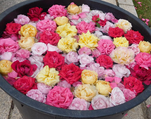 左はとても香りの良かったAVONという品種.ヘレボの水浮かべはよくあるが,ここではローズの水浮かべ@巨大鉢.
