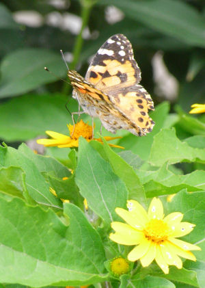 実家で地植えにされているメランポジウム,訪問者はアカタテハ.