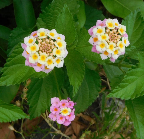 どこでも見かけるよくあるタイプで,黄色とピンクの2色のもの.低木になっている.調べてみるとランタナ・カマラの園芸品種で「コンフェッティ」と言うらしい.(Lantana camara 'Confetti')