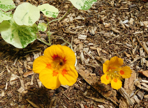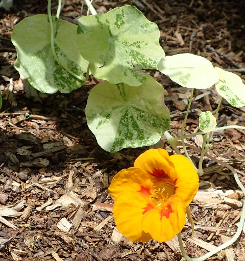 T&Mから今季販売されたナスタチウム,'Troika Spotty Dotty’が開花スタート.葉は斑入り葉.(画像左側の花)
