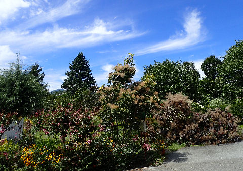 スモークツリーの花が終わり煙っている.秋の空が似合うガーデン.