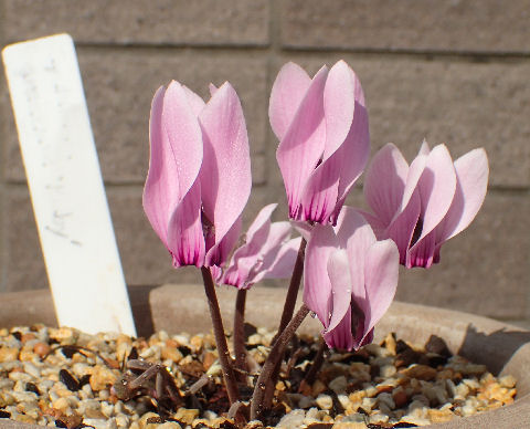 それは雨の当たらぬ南ベランダでシクラメン・グラエカム・ルビーが開花していたこと.以前は花芽にも気づいておらず,いきなりこの状態を見せられてビックリ!(@_@)