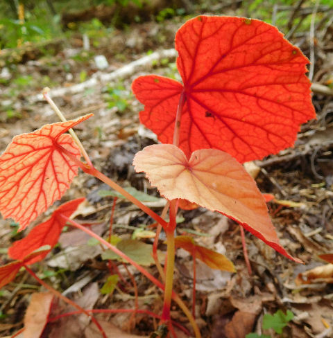 モミジがちらほら色づく中,地面間際でひときわ赤く目立っていたのがコレ.2016年にミヨシでゲットしたシュウカイドウ.葉の裏がやけに赤い.