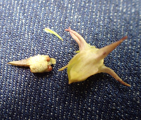 お茶袋をかけたものはまだ青かったが,他の株で熟していそうなのがあり採ってみた.種の入っている袋を破ってみると…小さな種が見えた.画像はしゃがんだ姿でジーンズ(太もも)の上で撮影.(^^;