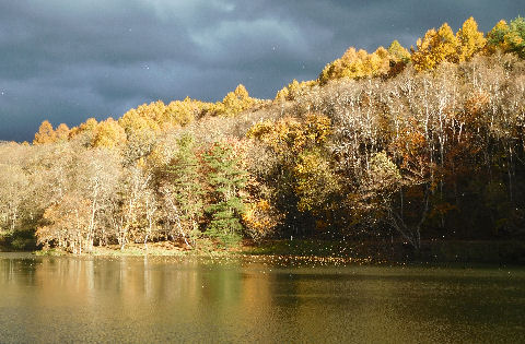 池のほとりを歩いているとビュービュー凄い風.それにつられて木々の黄色く色づいた葉がいっせいに舞い上がり,日に照らされてキラキラ輝きながら水面に舞い降りていった.雨が降るように落ち葉がゆっくり降っている.幻想的な光景にしばし見とれ,池のほとりに佇んでいた.雨上がりの晴れ間だっただけに空気が澄んでいてキレイ.(*^^*)