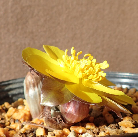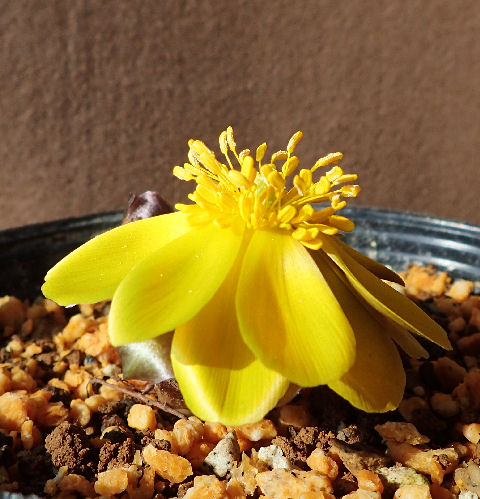 先日園芸店で購入後,南ベランダ在住のフクジュソウ仲間.ラベルには「アソフクジュソウ」とある.
