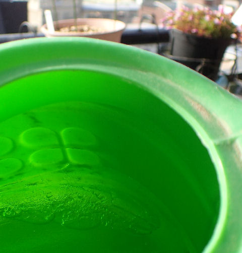 カチンコチン.なんと薄く氷が張っている.これは南ベランダでは初めて.北バルコニーでは以前経験済み.そういえば,今朝は北バルコニーへ出る窓が凍って外に出られなかった…植物たち,無事にしていると良いのだが.(~_~;)