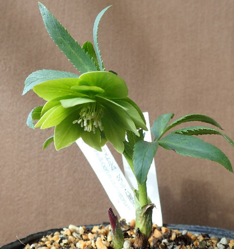 厳しい寒さの時,根が凍るのを防ぐため水を外に出して自衛反応するヘレボ.その時はお辞儀した姿になる.寒い朝にはよく見られる光景.ヘレボは日が昇ってくると回復する.そんな時に水やりをしたらダメ,とセミナーで聞いていた.放って置いたら復活するよ,と.