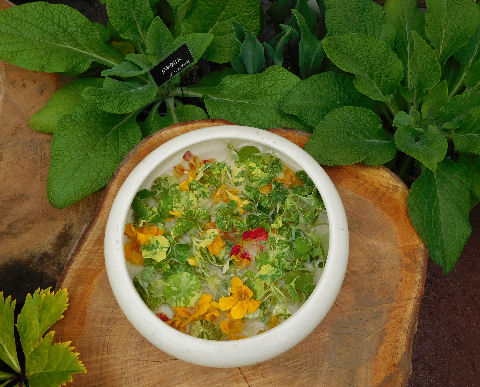 そして斑入りのナスタが植えられて…水を張った鉢にはカットした花や葉が飾られている.これってヘレボではよく見られる飾り方だが,ナスタがこんな具合に盛られていたらまるで「サラダみたい」と思ってしまった.(^^;