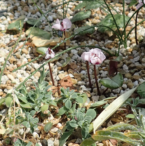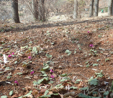 フクジュソウ群落の真向かいには原種シクラメンの群落がある.群落と言っても点々と点在している感じで,濃いピンク系のコウムが開花中.少し離れたところに温室があり,温室内では原種シクラメン各種が植えられ,端の方でコウムが花を咲かせていた.