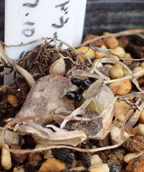 右の画像は球根の上に種を載せたもの.(ごちゃごちゃして見づらいけど(^^;)黒い小さな粒が見えている.ほんの少しだし面倒だからこのポットにパラパラしておこうかな…と一瞬思ったけど,一応採種.(^^;