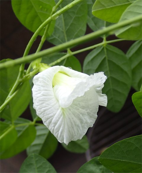 そして雨の止み間に北バルコニーに居るクリトリア大鉢2つを室内に取り込んだ.その時に気づいたのがコレ.「うわ,花が咲いてたよ~!!しかも白花!!(@_@)」表側から花が全然見えておらず,花芽が付いていたのは分かっていたけどまさか既に開花していたとは思ってもみなかった.