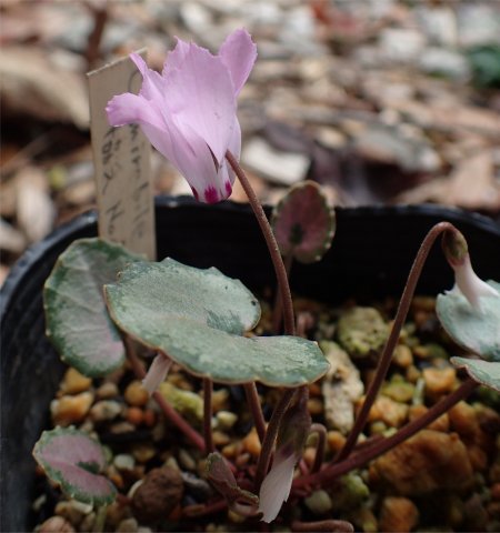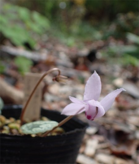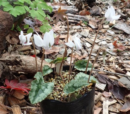 原種シクラメンたち.どれも花友さんからの苗.まずはヘデリフォリウム.蓼科にやってきた日には既に開花していた.白花が清楚.香りは無いのが残念.