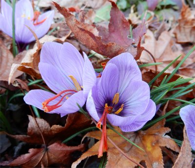 周囲は枯れ野原だけど,サフランは白のゴージャス・コルチカムの近くに居るので,この辺りは華やかコーナーとなっている.