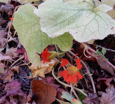 で,不要になった茎を濃色四国カッコソウの下に置いておいたところ,なんとオレンジの花が開花中!(^o^) カッコソウが霜除けになり,氷点下の気温もクリアしたという訳か.植物って強くて逞しい.