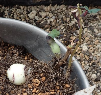 白肌のイモがある.右に見えてる葉の付いた根元も少しぷっくり.