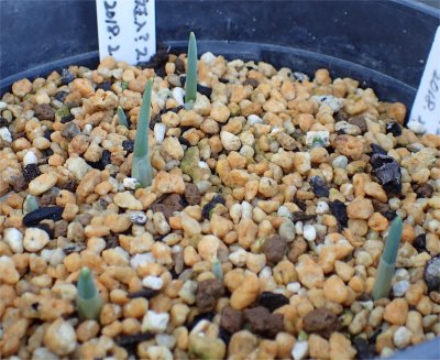 さらに.左からヒュッポリテ,ニヴァリス八重,エルウェシーその2(斑入り葉か?という子たち)ニヴァリス八重は植え付けたのが遅かったのにもうお目覚めでビックリ.
