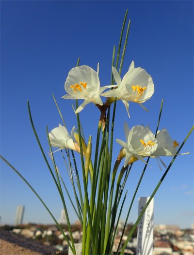 2019年がスタート.新年の幕開けは快晴.元旦って晴れの特異日だったかな.冷えて最低気温は0度近い.それでも南ベランダではまだポインセチアが健在.(^^;画像はバルボコディウム・ザイアニクス v. アルブス.バルボコディウムもいろいろあってややこしい.しかもどれも似ていて見分けがつかない.(~_~;)