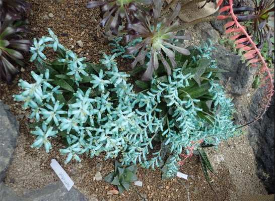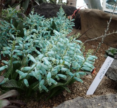 エキゾチックな花たちが並んでいる間に翡翠色の見慣れた植物発見.ラケナリア・ヴィリディフローラ@爆咲き中.