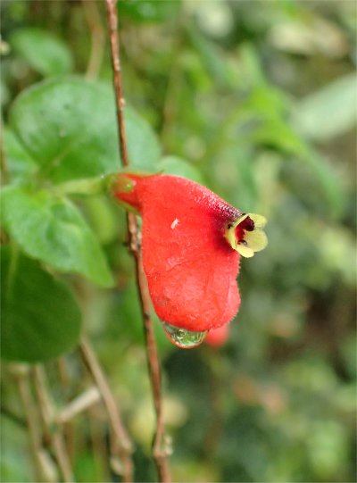 これは南米原産の植物で,咲くやこの花館では熱帯雨林室に吊り鉢にされて展示されていた.葉が下に下垂し,その途中で咲いていたのがこの花.