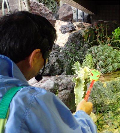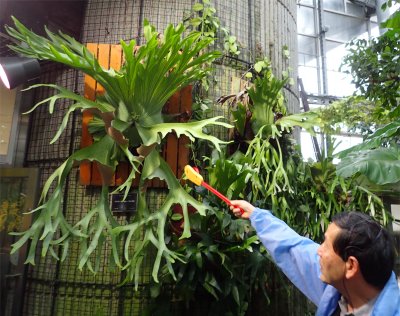 まず,ビカクシダ.樹木に着生するシダで,ビカクとは大きな鹿(架空の動物)という意味らしい.上の葉で落ちてくる落葉を集めて肥料を得,下の葉で光合成して胞子を放つ.画像は館長が指示棒代わりの妙なモンで葉をはたいて胞子を飛ばしているところ.