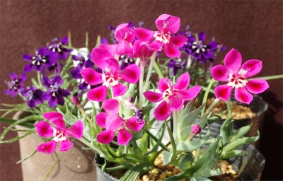 紫のオレオゲナ,ピンクのシレノイデス,共に花が増えてきた.既に終わった花もあり,それらは取り去っている.なかにはクキッと折れたようになっているものもあった.いくつか受粉した模様.温室内でもこんな感じで隣同士に置いているので交雑の可能性有り.さて,どうなることやら.