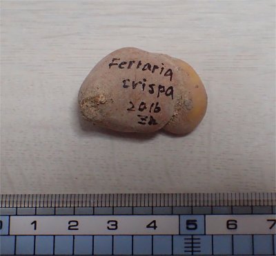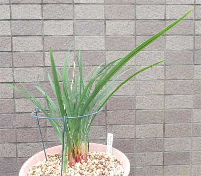 で,ウチにもフェラリアが居たなぁと思い,ここはグッと我慢で買い控え.帰宅後どこに居るか安否確認.南ベランダに置いていた.一応南アフリカ原産の半耐寒性球根扱いなので南ベランダに置いたのだろう.最初は直径12cmほどのポリポットに植えていたが園芸店の商品を見た後,これでは小さすぎると思って6号鉢に植え替え実施.植え替えた後北バルコニーへ移動し撮ったのが左の画像.植え替える際,ポロッと1つ茎とイモが分かれてとれてしまった.(~_~;) それが右端の画像.横幅4cm弱の大きめのイモ.