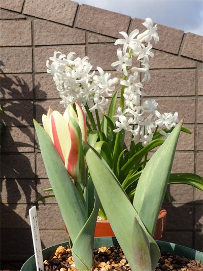 黄色の花弁に赤筋が入るユニークな配色.後ろは以前から開花していたヒヤシンス・オリエンタリスの白花.