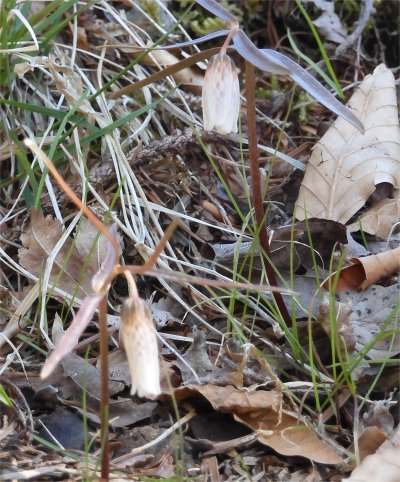 コバイモって小さい上に花色も渋い色,よって全く目立たない.名札が立っているので見ようと意志を持って見ると見つけられるが,気をつけていないと存在すら気づかず通り過ぎてしまう.