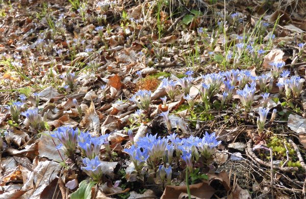 八ヶ岳薬用植物園では見通しが良く日当たりの良い芝生にフデリンドウが数多く点在していて見事.