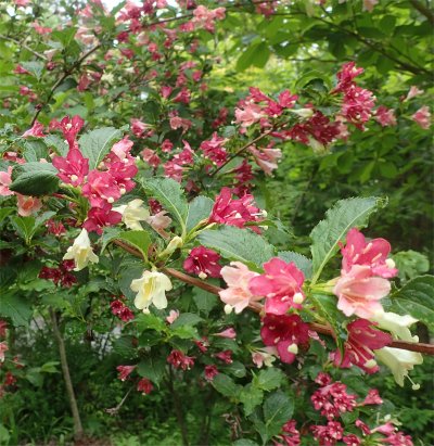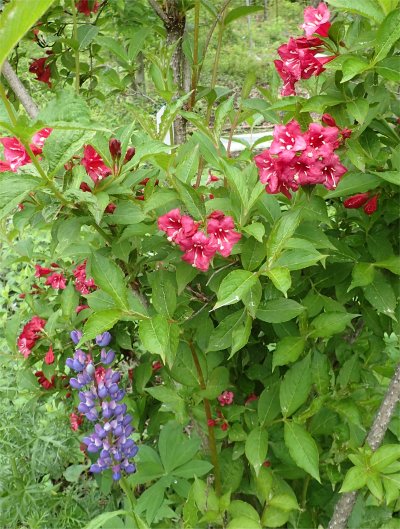 右はベニバナウツギ,勝手に生えてるルピナスとのコラボ.