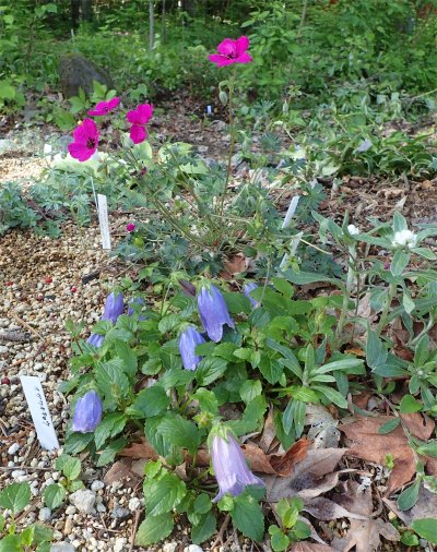 植えっぱなしのオガワキキョウとゲラニウム・サブコウレッセンスが開花中.すぐ近くにはトロパエオルムのポリフィラムも居る.