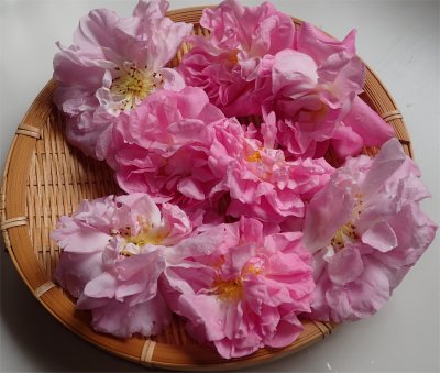 今朝わが家で収穫したロサ・ダマスク・セルシアナの花.