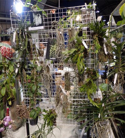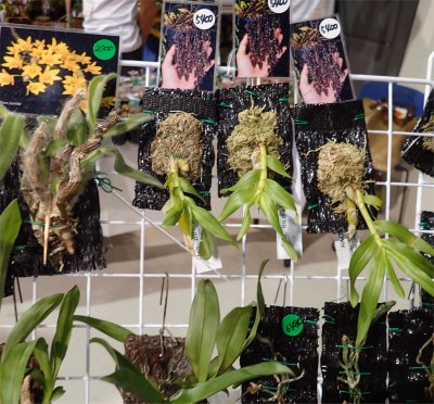 ここのランは何やら不思議なものにくっつけられている.ヘゴ板ではない黒いもの.よく見ると寒冷紗.話を聞くとこれが適当に水分を含んで良いらしい.いろいろ試して工夫されている.