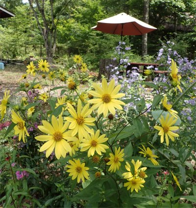 花数が増えているのが分かる.後ろの薄紫色はアスター・ジョリー・ジャンパー.背の高い物がひしめき合っているコーナー.(^^;
