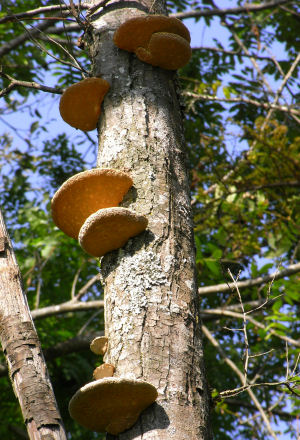 何気なく上を見上げたときに発見.樹上にキノコがいっぱい生えており,まるでお煎餅が樹木から出てきたみたい.