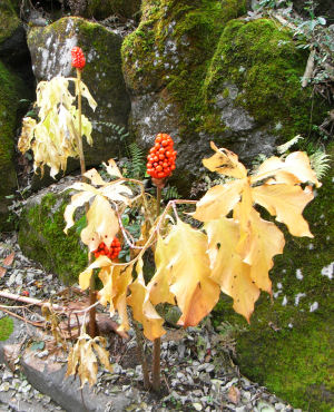 散歩していたら葉がすっかり黄変し,萎れる寸前のマムシグサを発見.それでもスックと立って赤い実はしっかり上を向いている.既に茎が折れてしまったマムシグサも見た中,このマムシグサ兄弟は頑張っている方.