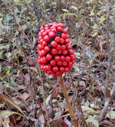マムシグサの赤は大きいので遠くからでも目立つ.